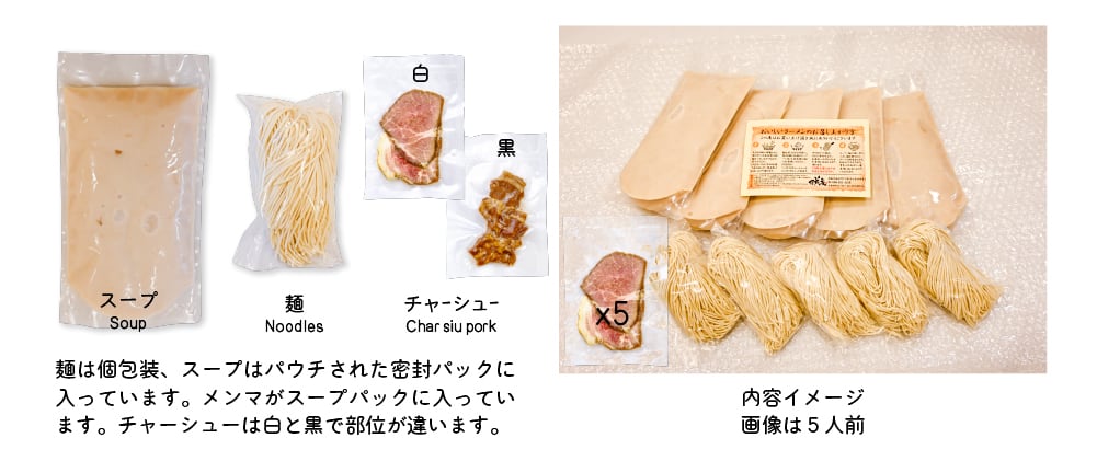 冷凍ラーメン「黒」贈答用梱包 徳島県産醤油蔵の特注醤油とたまり醤油をなどをブレンドした豚骨・鶏ガラスープです。 お店の味をそのまま急速冷凍しました。 贈答用に特製段ボール箱に巻紙を施し、発送用段ボール(80サイズ)に詰めてお届けします。 特製段ボール箱の様式は3、4人前で共通です。 <1人前内容> ・生麺一玉・白スープ(冷凍)・チャーシュー(冷凍) 麺は個包装、スープはパウチされた密封パックに入っています。 メンマがスープパック(白)に入っています。 賞味期限:発送日より1ヶ月